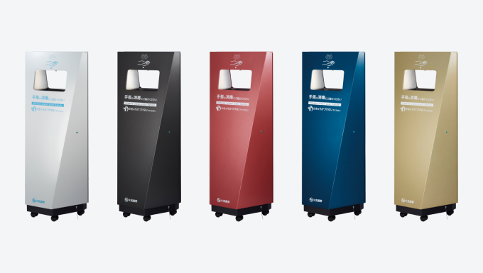 出入り時にもれなく消毒してもらうため、通り過ぎ防止を図る視認性の高いスタンド型デザインを採用。人の目にとまりやすく、手指消毒の徹底が図れます。オフィス、病院・福祉施設、ホテル、イベント会場、商業施設などブランドイメージやインテリアに合わせて、5色のカラーバリエーションから選べます。